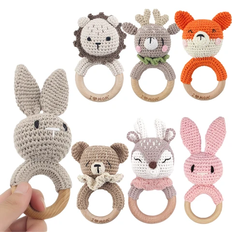 1PC Baby Rattles Cute Cartoon Bunny Crochet Rattle Toy Wood Ring Baby Teether Rodent Baby Gym Mobile Rattles Newborn Rattle Toys