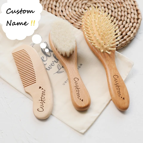 Custom Baby Hair Comb Brush Set Natural Wooden Comb Soft Wool Newborn Baby Bath Care Brush Personalized Massager Gift For Kids