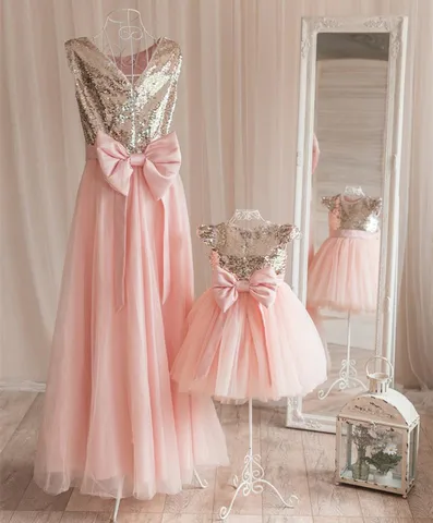 New Mother Daughter Matching Dresses Children Beautiful Birthday Party Gowns Kids Clothes with Bow Photoshoot Any Size