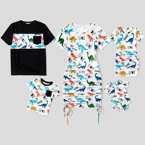PatPat Family Matching Outfits Allover Dinosaur Print Drawstring Ruched Bodycon Dresses and Short-sleeve T-shirts Sets