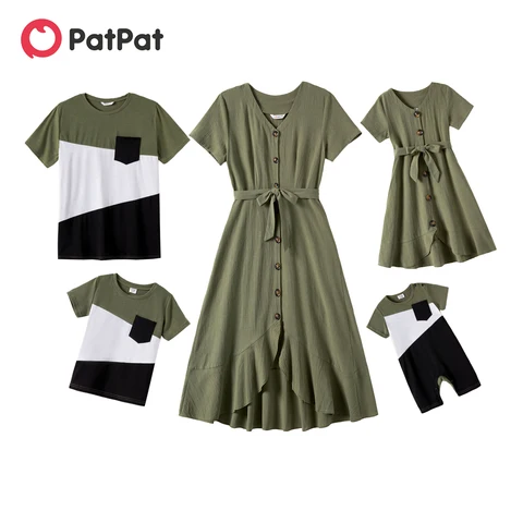 PatPat Family Matching Outfits 100% Cotton Short-sleeve Button Front Belted High Low Hem Dresses and Colorblock T-shirts Sets