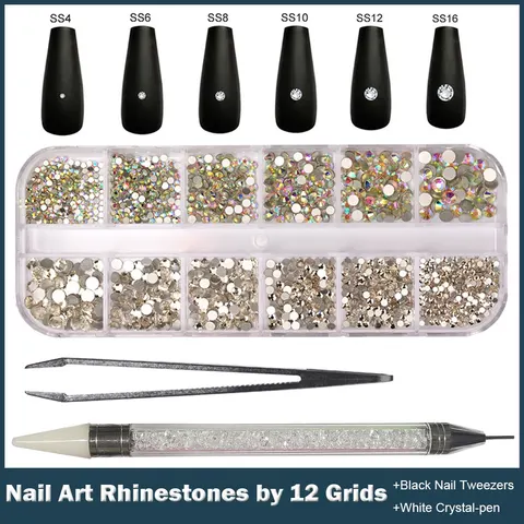 12 Grids Multi Sizes Nail Rhinestones Set Crystal AB Clear Gems with Crystal Pen Clips for DIY Nail Art Decorations