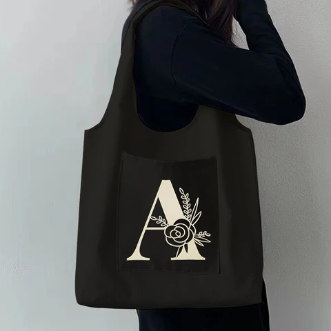 Simple Gold Letter Print Shopping Black Bags Canvas Tote Bag Printed Cartoon Reusable Cloth Bag Handbag Shoulder Bags Custom