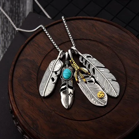 Fashion Metal Eagle Claw Feather Turquoise Pendant Necklace for Men Vintage Indian Four Feathers Necklace Valentine's Day Gift
