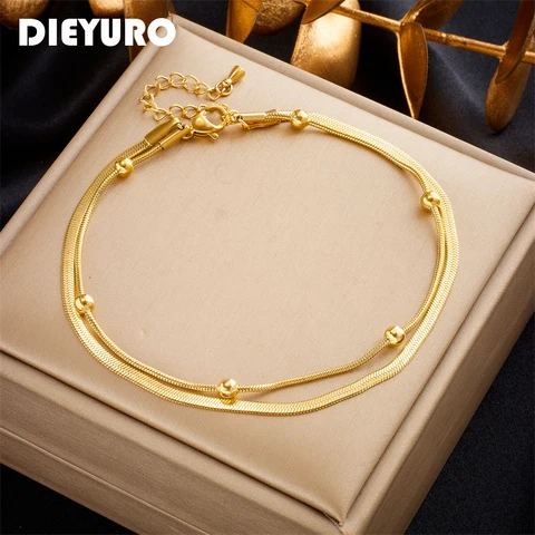 DIEYURO 316L Stainless Steel Gold Color Double-Layer Anklets For Women Girl New Trend Leg Chain Waterproof Jewelry Gift Party