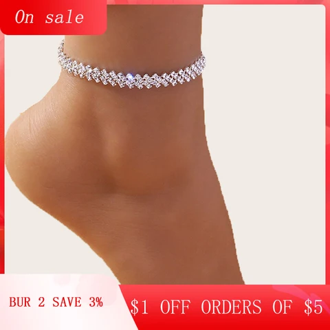 Uilz Boho Silver Color Shiny Rhinestone Chain Anklets for Women Beach Luxury Heart Bracelet on Leg Accessories Foot Jewelry