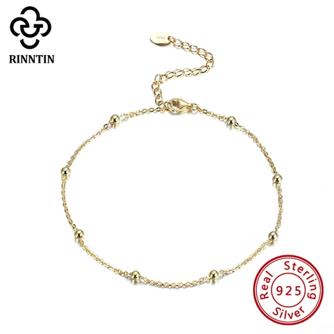 Rinntin Real 925 Sterling Silver 14K Gold Plated Ball Bead Chain Anklet 5CM Extension Chain For Girls Engagement Gift TSA05