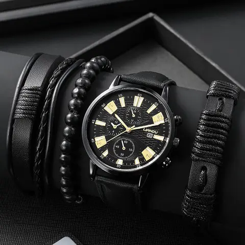 4pcs Black Round Quartz Watch With PU Leather Bracelet Men Nylon Business Watch Fashion Casual For Daily Sports