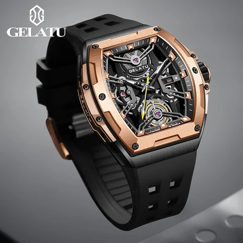 GELATU Original Luxury Watch for Men Automatic Mechanical Tonneau Waterproof Silicone Strap Sapphire Crystal Skeleton Wristwatch