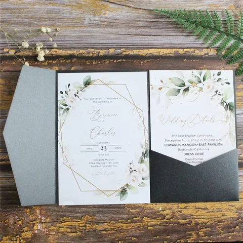 Black Wedding Invitation Card Tri-Fold Pocket Shimmer Country Party Invites Personalized Design Multi Colors