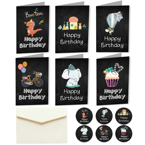 6sets Happy Birthday Card Cute Cartoon Dinosaur Cake Gift Postcard with Envelope Sticker Birthday Party Invitation Greeting Card