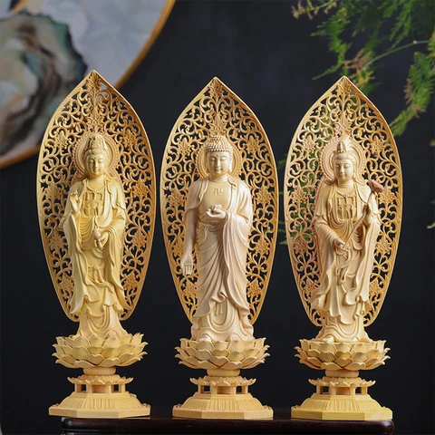Boxwood 29cm Three Buddha Sculpture Sakyamuni Figure Guanyin Wood Carving Goddess Statue Home Decor