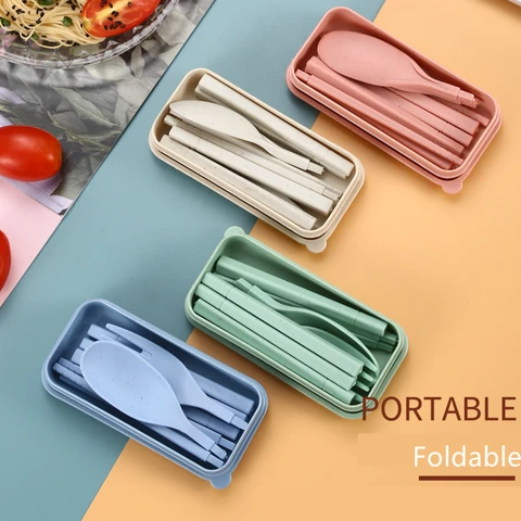 4PCS/Set Cutlery Wheat Straw Spoon Fork Chopsticks With Box Students Tableware Travel Portable Dinnerware Kitchen Accessories