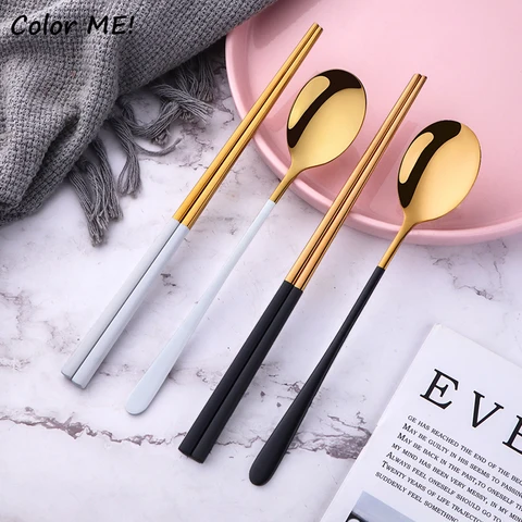 2Pcs 18/8 Stainless Steel Cutlery Set Sushi Sticks Coffee Tea Spoons Set Dinnerware Korean Chopsticks Dessert Spoon Flatware Set