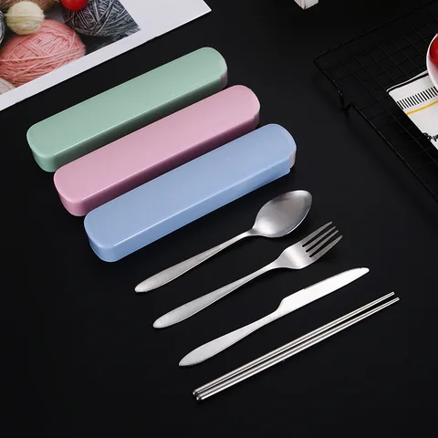 410 Stainless Steel Chopsticks Tableware Portable Fork Spoon Student Office Worker Three-piece Cute Storage Box cutlery set