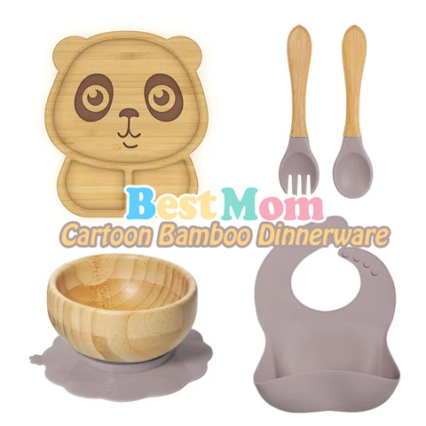 7PCS/Set Baby Stuff Bamboo Tableware Cup Bowl Plate/Tray Bibs Spoon Fork Sets Children Non-slip Feeding Free Dinnerware Dinner