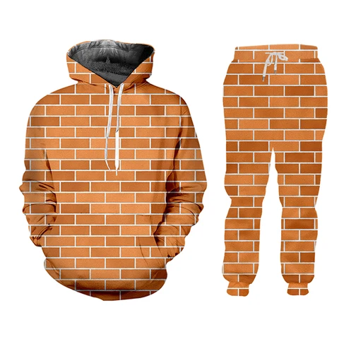 IFPD 2 PCS Set Red Brick Wall Print Soprts Hoodies Pants Women/Men Brick Splicing Sweatshirts Plus Size Tracksuit Couple Outfit