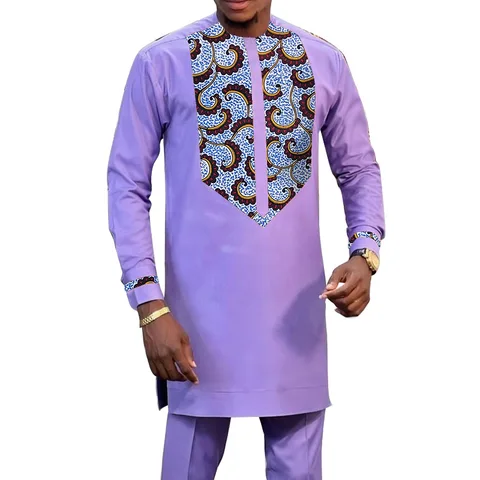 Pinkish Purple Men's Groom Suit Patchwork Shirts With Solid Trousers Nigeria Fashion African Wedding Outfits