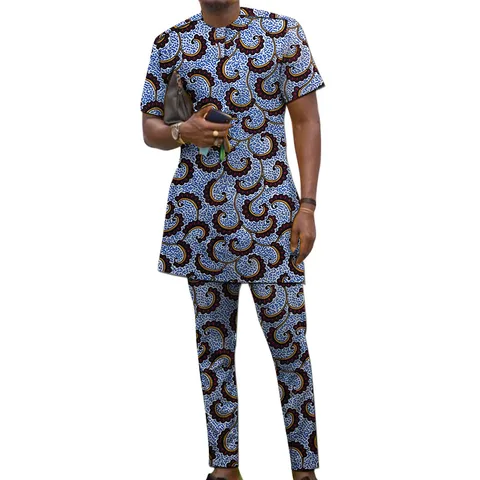 African Print Short Sleeve Simple Set Men's Groom Suit Male Nigerian Fashion Pant Sets Wedding Party Outfits