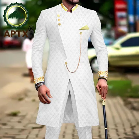 APTX African Clothes for Men Wedding Two Piece Set Dashiki Embroidery Jacket and Trousers with Kerchief Formal Slim Fit A2216037