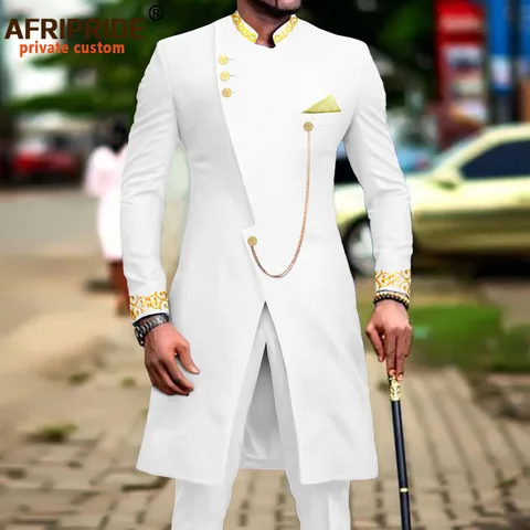 African Suit for Men Dashiki Long Embroidery Jackets and Pants 2 Piece with Kerchief Slim Fit Formal Outfits Wedding A2216037