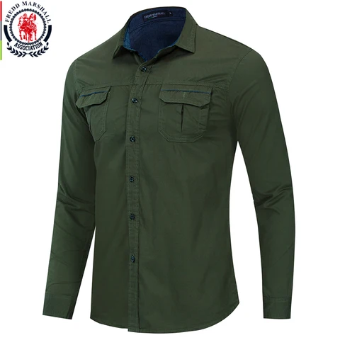 Fredd Marshall 2019 Autumn New Classic Military Shirts Men Casual Solid Color Cargo Basic Shirt Long Sleeve 100% Cotton Tops 213