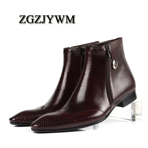 ZGZJYWM New Cowhide Pointed Toe Genuine Leather Fashion Men's Zipper Work Bullock Patterns Oxford Dress Shoes For Men Boots