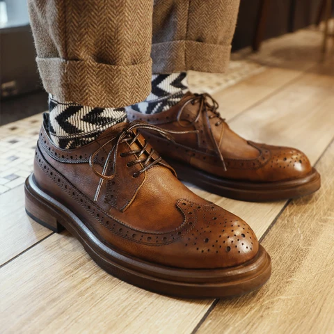 Formal Men's Shoes British Style Round Head Brock Carved Business Casual Leather Shoes Thick Soles Increase Shoes Wedding Shoes