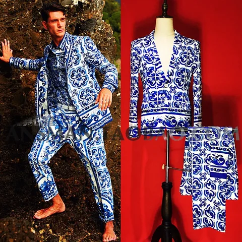 Spring New Men Blazers Coat Clothing Singer Fashion Slim Blue White Porcelain Suit Male Plus Size Jacket Performance Costumes