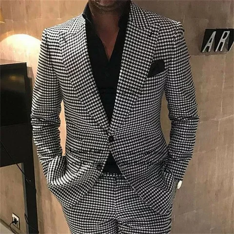 Formal Houndstooth Men Suits Peaked Lapel Groom Wedding Tuxedos 2 Pieces Sets Business Male Blazers Slim Fit Costume Homme