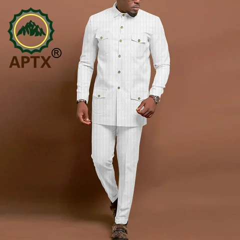 African Traditional Men Outfit Suit Long Sleeve Single Breasted Top Trousers Slim Fit Party Formalwear 2 Piece Set A2216036