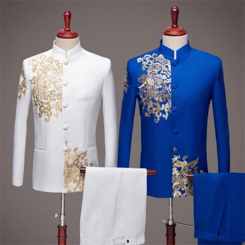 Blazer Men Chinese Tunic Suit Set With Pants Wedding Singer Star Style Dance Stage Cloth Style Formal Dress Stand Collar Blue