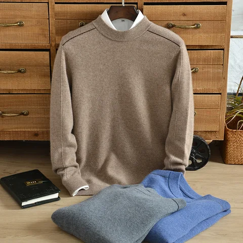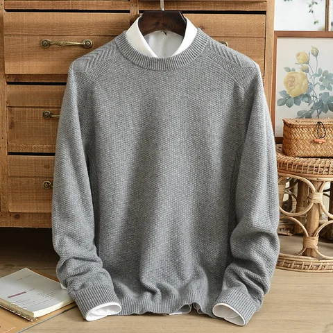 Winter new pure cashmere sweater men's round neck thick wool knit sweater loose pullover jacquard solid color base sweater