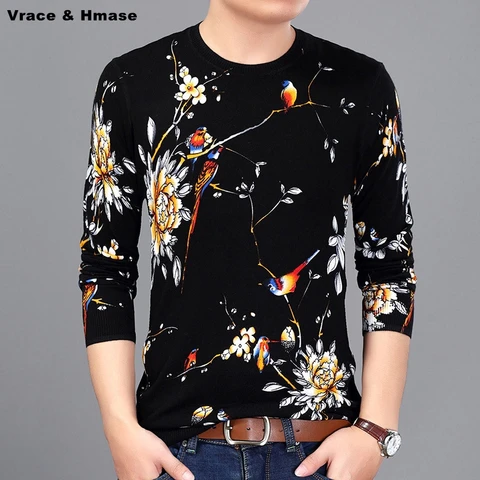 Chinese style flowers bird pattern printing fashion casual sweater Autumn&Winter 2017 New quality sweater men Black,White M-4XL