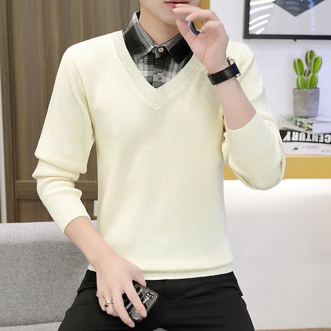 New Arrival Autumn/Winter Korean Style Men Base Shirts Men's Fake Two Pieces Sweater Shirt Collar Pullover Male M-3XL M842