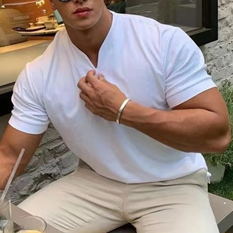 Men's T-Shirt Fashion V-Neck Solid Color Tees Casual Spring Summer Outdoor Sport Gym Black White Male Loose Shorts Sleeve Shirts