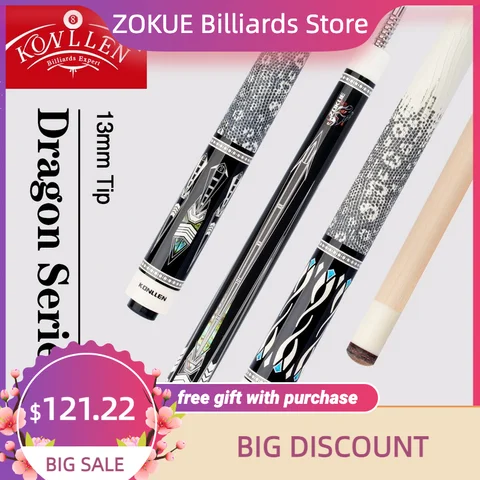 KONLLEN Billiard Pool Cue 13mm Tiger Everest Tip Canadian Maple Shaft Sticks XTC Ferrule 148cm Leather Wrap 3/8*8 Joint Play Cue