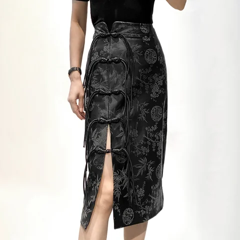 Leather leather skirt, Spring 2023 New Chinese style printed slit hip wrap skirt Mid length sheepskin skirt