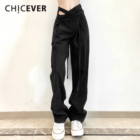 CHICEVER Minimalist Black Cut Out Denim Women's Pant High Waist Full Length Patchwork Loose Baggy Jean Female Autumn Style