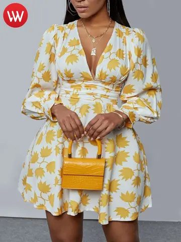 LW Sweet 2022 Fashion Dress Deep V Neck Floral Print Mini A Line Cleavage Women Clothings Summer Long Sleeve Lady Outfits
