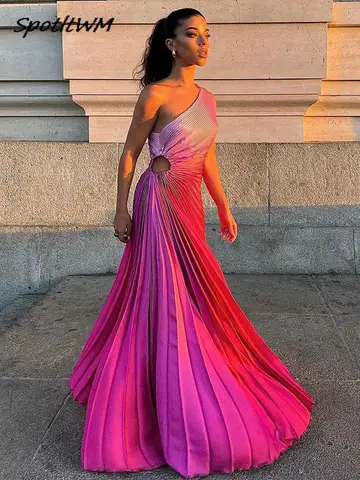 Women Elegant Pleated Tie Dye Diagonal Collar Maxi Dresses Female Hollow Out Backless Sleeveless Irregular Lady Evening Vestidos