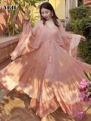 VGH Vintage Loose Patchwork Mesh Dresses Female V Neck Butterfy Long Sleeve High Waist Lace Up Hit Color Dress Women Fashion New