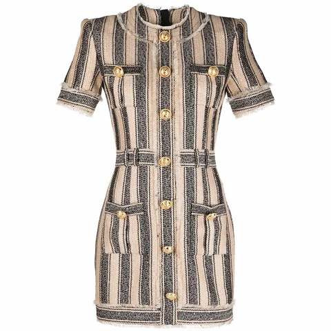 HIGH STREET Newest 2023 Designer Women's Summer O-Neck Pockets Button TASSEL Short Sleeve Sheath Vintage Striped Dress