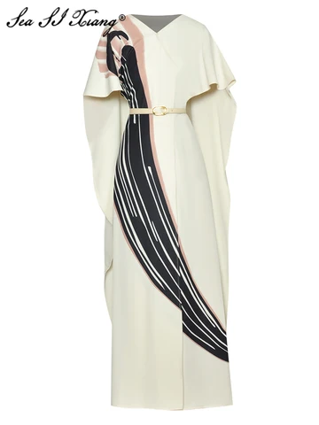 Seasixiang Fashion Designer Summer Maxi Dress Women V-Neck Cloak Sleeves Belt Print Elegant Party Floor-Length Dresses