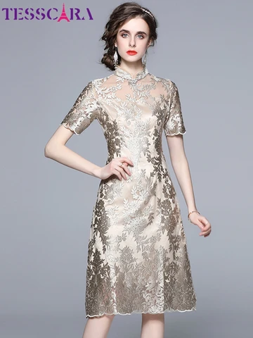 TESSCARA Women Luxury Embroidery Mesh Dress Festa High Quality Elegant Weddding Cocktail Party Robe Vintage Designer Vestidos