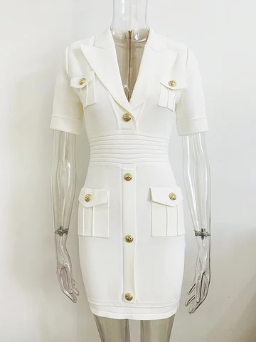HIGH STREET Newest Designer Runway Fashion Women's Short Sleeve Notched Collar Lion Buttons Knit Dress