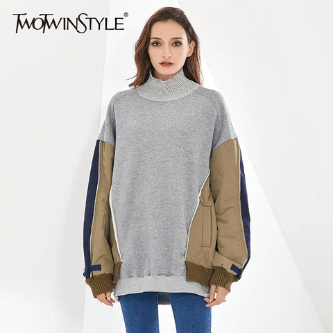 TWOTWINSTYLE Patchwork Sweatshirt For Women Turtleneck Batwing Long Sleeve Hit Color Pullovers Sweatshirts Female Clothing