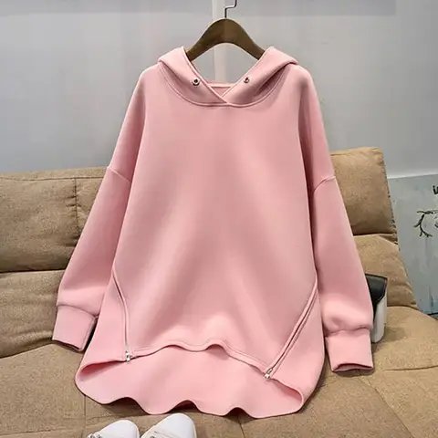 Women Sweatshirt Solid Color Zippers Eyelet Long Sleeve Streetwear Spring Autumn Loose Irregular Bottom Pullover Hoodie Top