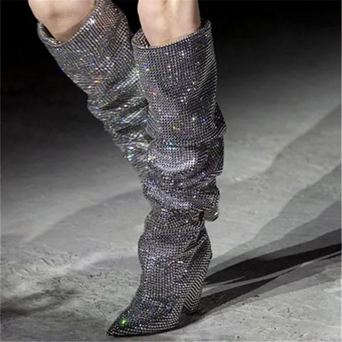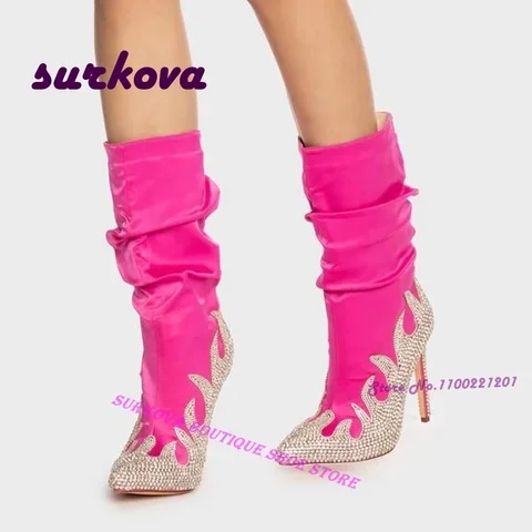 Rose Red Diamond Slip On Boots Pointy Toe Stage Sexy Calf Boots Thin Heels Crystal Satin Women's Shoes Winter Elegant Plus Size