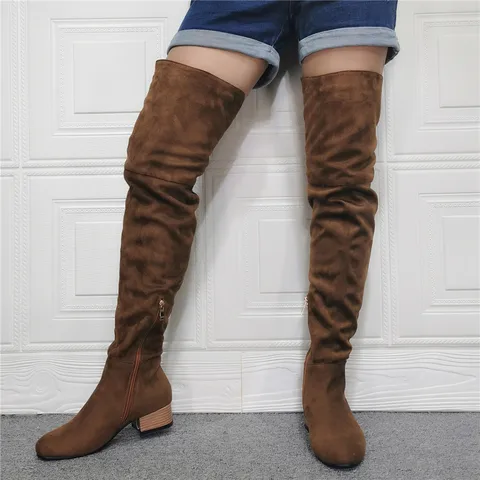 Fashion Leather Women's Shoes Winter Chunky Heels Zipper Sexy Elegant Ladies brown Flock Over the knee Boots 42 43 Real Photo